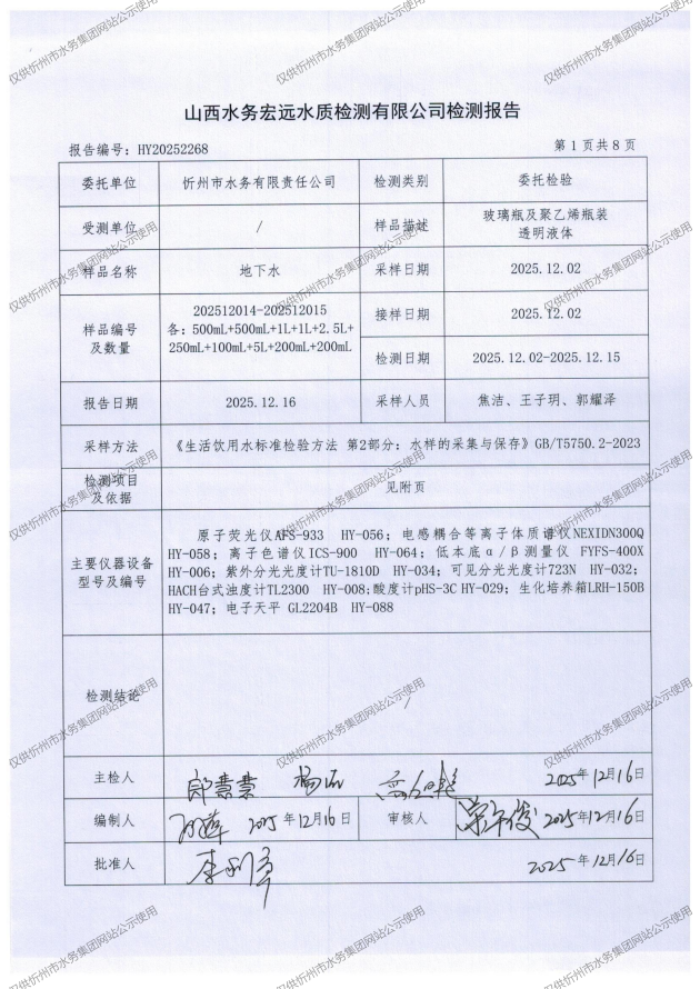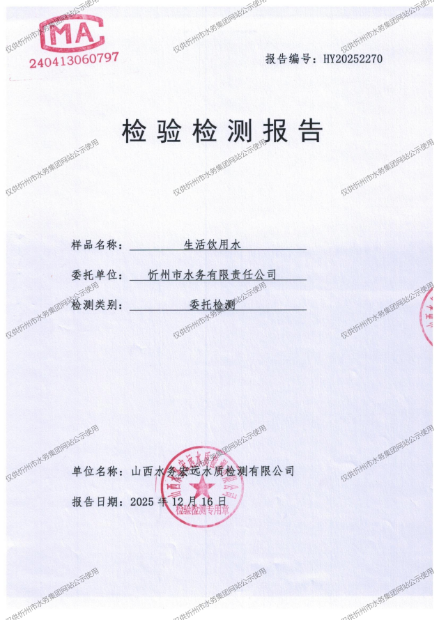 忻州城區(qū)公共供水水源水、出廠水、管網(wǎng)水、管網(wǎng)末梢水2025年12月份水質信息公示